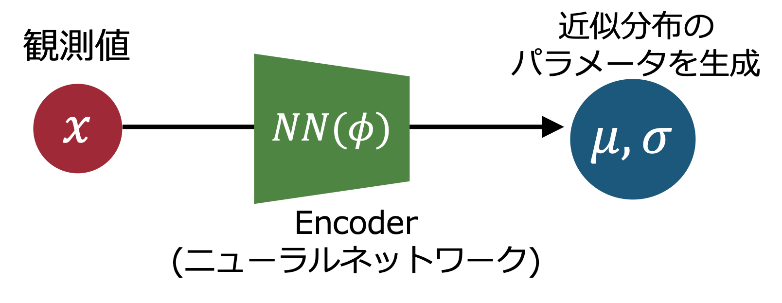 しかしながら、大きなデータセットに対しては、各データ点ごとに異なるパラメータを持つのは非効率・非現実的である。 そこで、近似分布のパラメータ \(\phi\) 自体もニューラルネットワークを用いて入力データ \(x^{(i)}\) から計算するようにする。